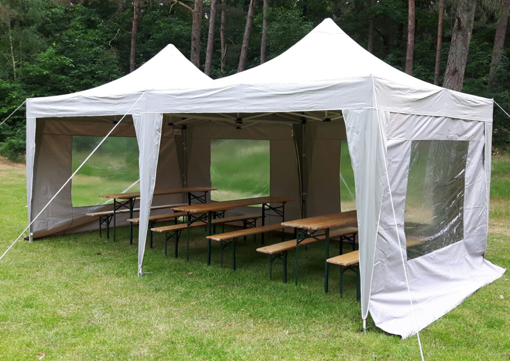 PrijsopgaveDubbele pagode tent 6x3 meter, met of zonder zijwanden en in combinatie met tafels en banken. Maximaal 18 volwassenen of 24 kinderen.