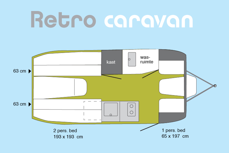 Met een opbouwlengte van 440 cm heb je een fijn verblijf voor een originele vakantie. Met z'n tweeën of met je gezin van 3 à 4 personen. De retrocaravan staat compleet met luifel, inventaris en koelkast voor je klaar op de rustige knusse minicamping in Westervelde vlakbij Norg in de kop van Drenthe.